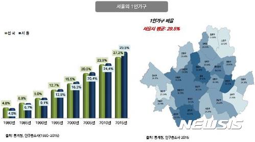 서울시 25개 자치구중 1인가구 비율이 30% 이상인 자치구는 관악구(44.9%)·중구(37.8%)·종로구(37.5%) 등 12개 지역이다.