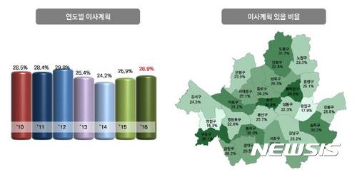 이사계획 있음 비율이 높은 지역은 중구(36.8%)·구로구(35.1%)·동대문구(34.8%) 순으로 나타났다.