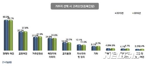 거주지 선택 시 고려요인을 묻자 '경제적 여건(60.1%, 중복응답)'이 가장 많았다. 교통(37.8%)과 거주 안정성(27.9%), 해당지역 이미지(24.8%) 순으로 고려하는 것으로 나타났다.