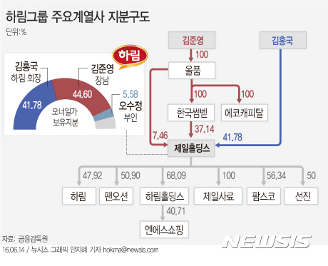 준영씨는 20살이던 2012년 김홍국 회장으로부터 올품(당시 한국썸벧판매) 지분 100%를 물려받았고, '올품→한국썸벧→제일홀딩스→하림'으로 이어지는 고리를 통해 하림그룹을 쥐락펴락할 수 있는 지배력을 확보했다. 에코캐피탈은 올품의 100% 자회사로, 2015년 올품이 하림홀딩스와 제일홀딩스로부터 매수한 후 사실상 준영씨 개인회사가 됐다.
