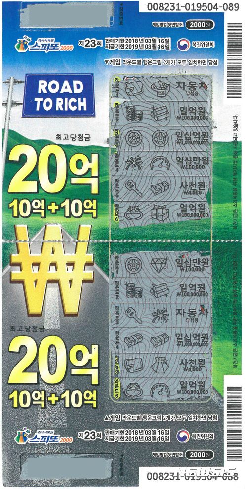 스피또2000은 1등 복권 2장을 한 세트로 연결한 연식발행으로 당첨금(10억)을 2배로(20억) 받을 수 있다.