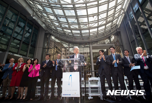 한진그룹은 23일(현지시각) LA 다운타운 윌셔 그랜드 센터에서 조양호 한진그룹 회장, 조원태 대한항공 사장, 크리스 마틴 A.C.마틴사 최고경영자(CEO) 등이 참석한 가운데 윌셔 그랜드 센터 개관 행사를 개최했다고 24일 밝혔다.