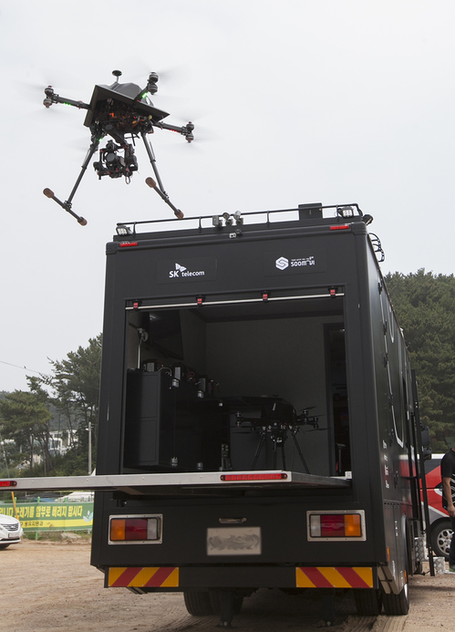 SK텔레콤은 지난 14일 인천의 한 해수욕장에 초소형 영상 중계 장비가 달린 드론이 공중에서 라이프가드 역할을 수행하는 시연을 벌였다. 운영요원이 관제차량 안에서 구조용 드론을 출동시켜 실시간 모니터링하며 혹시 모를 사고에 대비했다.
