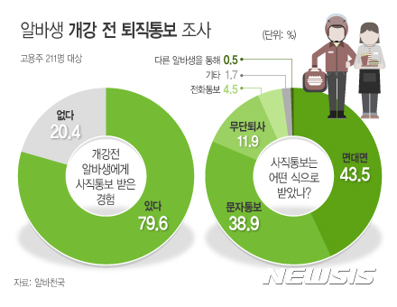 지난 달 알바천국이 고용주 211명을 상대로 한 설문조사 결과에 따르면 고용주 10명 중 8명(79.6%)은 대학교 개강으로 알바생에게 사직 통보를 받은 경험이 있었다고 답했다. 받았던 사직 통보 유형은 '면대면 대화'(43.5%)가 가장 많았고 '문자통보'( 37.9%), '무단퇴사'(11.9%)가 뒤를 이었다. 고용주 75.8%는 알바생의 갑작스런 사직 통보로 인해 난처했던 경험이 있었다고 했다. '당장의 일손 부족'(79.5%)과 '거짓말을 했다는 실망감'(9.4%)' 등 때문이다.