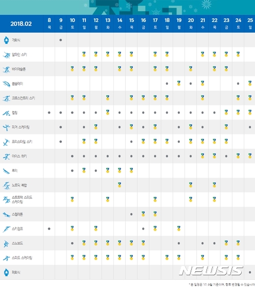 이날 공개된 일정은 종목별 예선과 메달 결정전 날짜와 시간으로 단체 경기인 아이스하키와 컬링 종목의 대진은 각각 10월과 12월 중 공개된다.