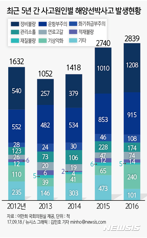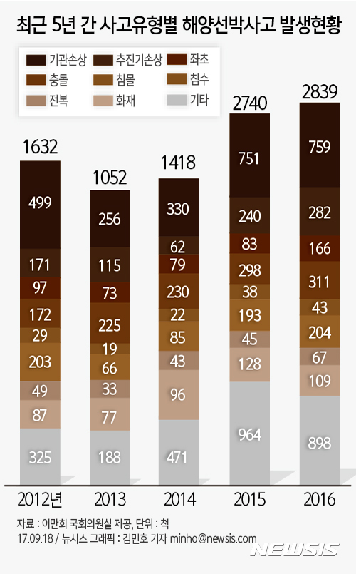 국회 농림축산식품해양수산위원회 소속 자유한국당 이만희 의원이 해양경찰청으로부터 제출받은 '해양선박사고 현황'을 보면, 지난 2013년 1052건에서 2014년 1418건, 2015년 2740건, 2016년 2839건으로 최근 4년간 2.7배 급증한 것으로 집계됐다.