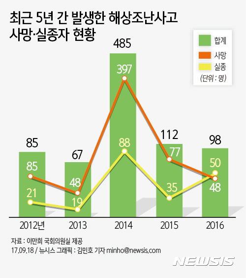 또 사망·실종자 현황에 따르면 지난 2013년 67명에서 2016년 98명으로 최근 4년간 46.3% 증가했다. 특히 세월호 사건이 발생한 2014년도의 경우 사망·실종자가 485명으로 전년 대비 7.2배나 급증했다.