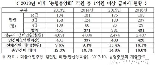 농협중앙회의 억대 연봉자를 연도별로 보면 ▲2013년 451명 ▲2014년 371명 ▲2015년 381명 ▲2016년 401명로 나타났다.