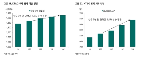 한편 궐련담배 시장에서는 '에쎄 체인지' 등 캡슐담배가 젊은층 사이에서 저변을 확대하고 있는 점과 필립모리스가 상대적으로 전자담배에 집중하고 있기 때문에 KT&G 점유율은 현 수준(61~62%)을 유지할 것으로 전망된다.