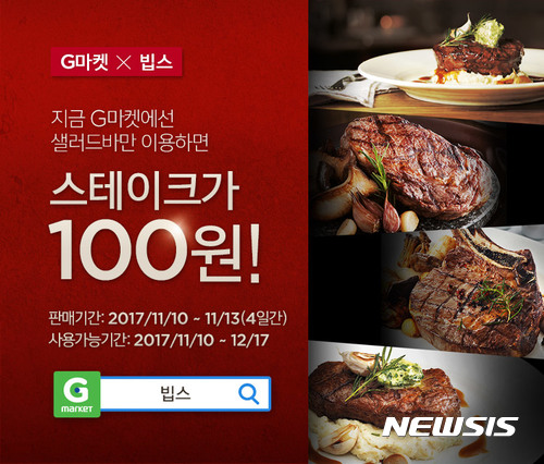 【서울=뉴시스】최선윤 기자 = G마켓은 국내 대표 패밀리레스토랑 빕스와 함께 11월10일부터 13일까지 총 4일간 'G마켓X빕스 판타스텍4' 프로모션을 진행한다. 빕스의 인기 스테이크 메뉴를 이용할 수 있는 e쿠폰 4종을 각각 단돈 100원에 판매한다.