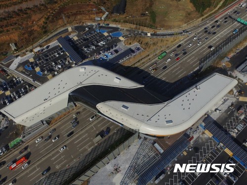 【서울=뉴시스】박정규 기자 = 풀무원 계열 이씨엠디 등 3개사가 합자 설립한 '그린익스프레스파크'가 국내 최초로 도로 위 공중을 가로질러 세운 '상공(上空)형 복합 휴게소'를 개장했다.