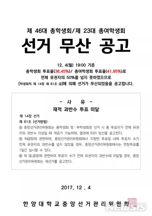 한양대 중앙선거관리위원회(선관위) 측은 연장으로 4일까지 이어진 투표에도 불구하고 투표율이 전체 유권자의 과반수를 넘지 못해 선거가 무산됐다고 공고했다.