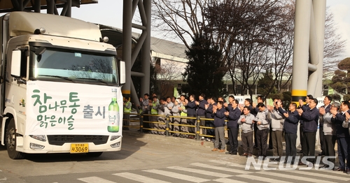 【서울=뉴시스】김종민 기자 = 하이트진로(대표 김인규)가 준 프리미엄 소주 '참나무통 맑은이슬'을 14일 이천공장에서 첫 출고했다. 출고된 물량은 서울을 중심으로 수도권 주요 유흥업소에 우선적으로 공급돼 판매될 예정이다.