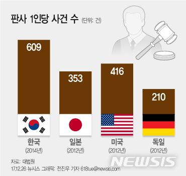 또 독일은 2012년 기준 법관 1인당 맡은 사건이 210건에 불과했고, 일본은 같은 해 판사 1인당 사건 수가 353건에 그쳐 우리 나라에 비해 현저히 낮았다.