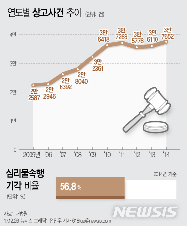 상급심에서도 소송 수는 증가하는 추세는 이어지고 있다. 대법원에 따르면 전체 상고사건 수는 2005년 2만2587건에서 2009년 3만2361건에 이르렀다. 2014년에는 3만7652건으로 증가했다. 2014년 기준 대법관 12명(대법원장·법원행정처장 제외)이 각 3137건의 사건을 처리한 셈이 됐다.