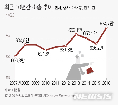 1일 대법원에 따르면 2016년 한 해 법원에 접수된 소송사건(사법연감 기준)은 총 674만7513건이다. 같은 시기 인구가 5169만여명(통계청 기준)이었던 점을 감안하면 국민 8명 중 1명이 소송을 냈다는 이야기다. 2015년 636만1785건 대비 약 6.06% 증가한 수치다.