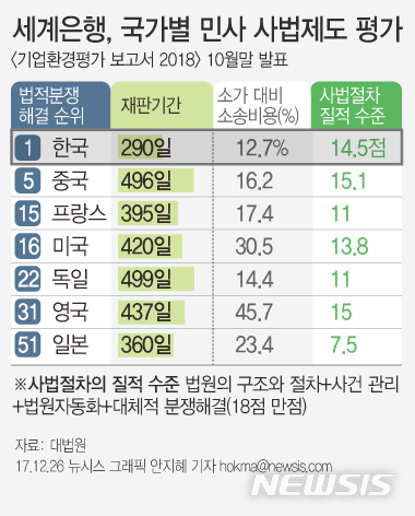 세계은행이 지난 10월 발표한 '기업환경평가 보고서(Doing business 2018)' 민사 사법제도 부문을 보면 우리나라의 평균 재판 기간은 290일이다.