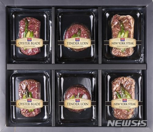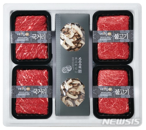 축산 선물세트로는 ‘농협 안심한우 건버섯품은 정육냉동세트’(안심한우 국거리350g*2+불고기350g+표고채100g, 7만9800원), ‘프리미엄 스테이크 냉장세트’(안심 스테이크150g*2+채끝 스테이크200g*2+부채살 스테이크 200g*2, 7만8000원) 를 선보인다.