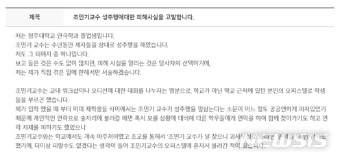 지난 20일 이 대학 연극연학과 졸업생이라고 밝힌 김유리씨는 청주대학교 인터넷 홈페이지 게시판에 '조민기교수 성추행에대한 피해사실을 고발합니다'는 제목의 글도 올렸다.