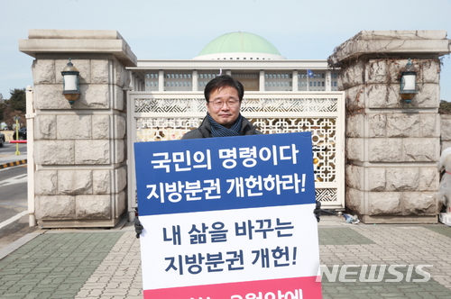 그는 이어 "지난해 광화문 촛불에서 나타났듯 국민은 자치분권이 우리 삶의 운영원리로 바뀌어야 한다, 대한민국은 너무 중앙집권화돼 있다, 지방이 살지 않으면 대한민국도 살아나기 어렵다는 공감대를 이루고 있다"며 "국민과의 약속인 만큼 반드시 이번 지방선거에 동시투표를 통해 개헌을 실시해야 한다는 의지를 전달키 위해 국회 앞에 섰다"고 밝혔다.