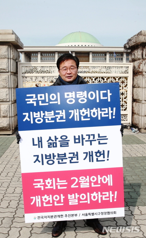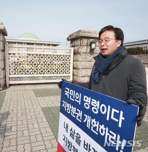 김 구청장은 1인 시위 현장에서 뉴시스와 인터뷰를 갖고 "2018년은 지방분권 원년이 돼야 한다"며 "이것은 나 자신만의 주장이 아니라 지난 대선때 각 정당의 후보들이 국민에게 약속한 것"이라고 말했다.