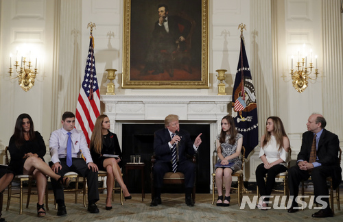 【서울=뉴시스】 오애리 기자 = 총기난사사건을 겪은 미국 플로리다 고등학교 학생들과 희생된 학생의 부모들, 2016년 샌디훅 초등학교 총기사건 피해자 가족들이 21일(현지시간) 백악관에서 도널드 트럼프 대통령을 만나 총기규제의 필요성을 호소했다.