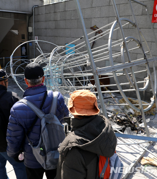 【서울=뉴시스】이영환 기자 = 보수 단체들의 태극기 집회 중 훼손된 촛불 조형물이 2일 오후 서울 종로구 광화문 광장 한켠에 자리하고 있다. 지난 1일 열린 보수 단체들의 태극기 집회에서는 참가자들이 광화문 광장에 설치된 촛불 조형물을 부수고 불을 지르는 사건이 일어났다. 2018.03.02. [email protected]