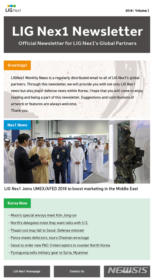 LIG넥스원이 새롭게 선보인 영문 소식지는 회사의 사업현황 및 주요 활동 등을 담은 'LIG Nex1'과 국내 주요 국방·방산 뉴스를 알리기 위한 'Korea Now' 등의 콘텐츠로 구성됐다.