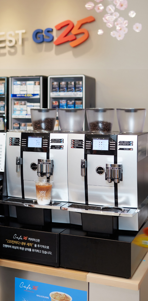 GS25에서 선택한 프리미엄 커피머신은 1300만원대의 스위스 커피머신 유라 기가(JURA GIGA X8G)다. 프리미엄 전자동 커피머신을 개발·생산하고 있는 스위스의 유라(JURA)의 최고 사양 상업용 커피머신이다. 유라는 GS25에 상업용 커피머신 1만대를 납품했다.