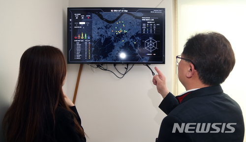 관제센터 화면에는 공사장 위치별로 미세먼지 농도와 소음 강도에 따라 매우 나쁨 '빨강', 나쁨 '주황', 약간 나쁨 '노랑', 보통 '초록', 좋음 '파랑' 등 5가지 색으로 표시된다.