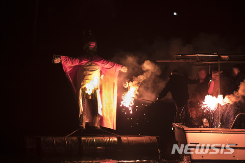 【에르미오니( 그리스)= AP/뉴시스】그리스정교의 부활절 전통의식 중 유다상의 해상 화형식을 거행하고 있는 에르미오니 마을 사람들.