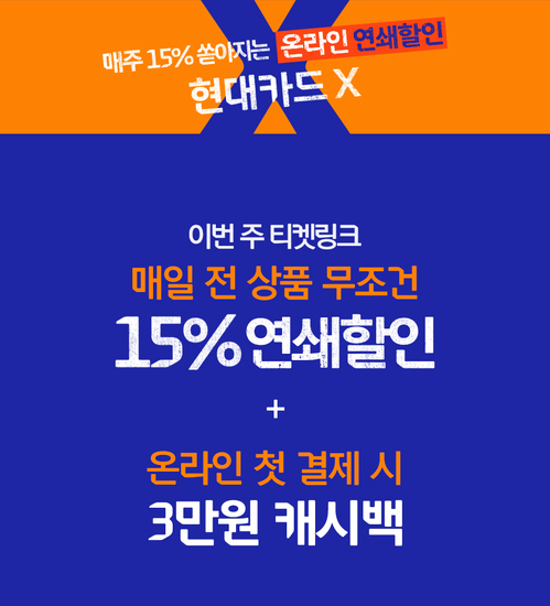 이벤트는 오는 15일까지 진행된다. 행사 기간 중 현대카드X로 티켓링크 상품을 결제하면 1일 1만원 한도 내에서 15% 청구할인 혜택을 제공한다. 현대카드X 첫 결제자는 온라인 5만원 이상 구매 시 3만원 캐시백 추가 혜택까지 받을 수 있다.