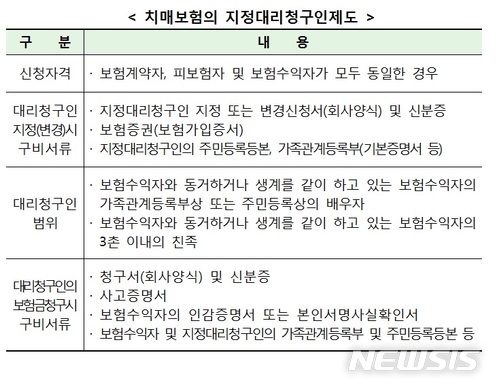 이를 방지하기 위해 금감원은 '지정대리청구인제도'를 소개했다. 보험계약자와 피보험자 및 보험수익자가 모두 동일한 경우 치매 등으로 보험금을 직접 청구할 수 없는 사정에 대비해 가족 등이 보험금을 대신 청구할 수 있도록 대리청구인을 지정하는 제도다.