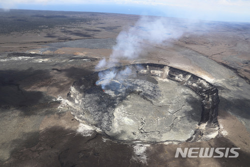 【호놀룰루( 하와이) = AP/뉴시스】 미국지질조사국이 배포한 지난 달 22일 하와이 빅 아일랜드의 킬라우에아 화산 폭발 사진. 이곳에서는 30일 푸우오오 분화구 바닥이 붕괴하면서 새로운 분출이 시작되었고 3일에는 규모 5.0의 지진도 일어났다.
