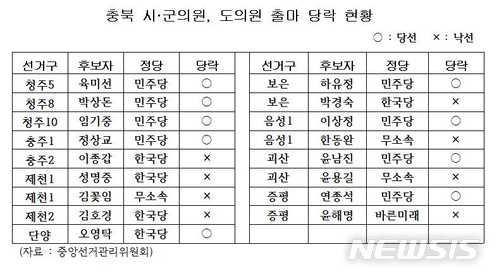 민주당에서는 육미선(청주5·여), 박상돈(청주8), 임기중(청주10), 정상교(충주1), 하유정(보은), 이상정(음성1), 윤남진(괴산·여), 연종석(증평) 당선인이다.