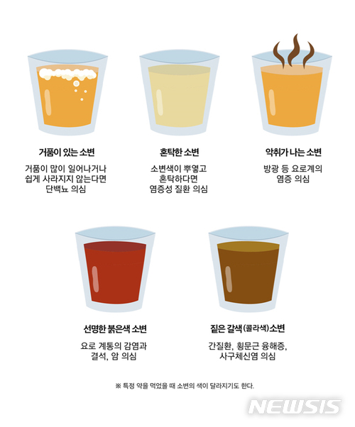 정상적인 소변은 맑고 엷은 황갈색을 띤다. 소변색이 불투명하고 뿌옇다면 감염 질환을 의심해 볼 수 있다. 급성신우신염, 신장에 세균이 감염되어 발생하는 감염 질환이나 방광염 등 염증성 질병이 있을 경우 백혈구와 세균의 영향으로 소변색이 뿌옇게 흐려진다.