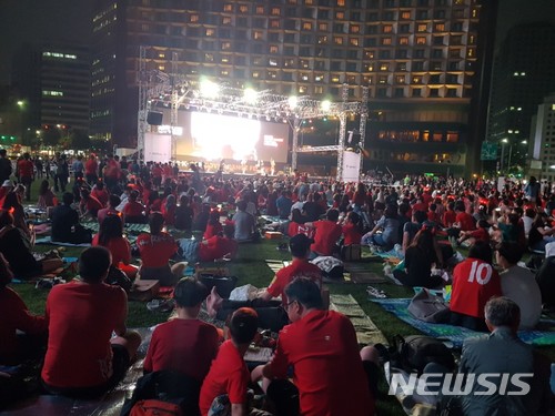 【서울=뉴시스】김지은 기자 = 서울 광화문 광장에 모인 시민들이 공연을 즐기며 멕시코전을 기다리고 있다.
