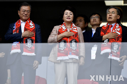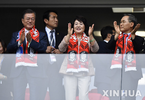 【로스토프나도누(러시아)=뉴시스】 박지혁 기자 = 문재인 대통령이 2018 러시아월드컵 한국-멕시코의 조별리그 2차전이 열리는 러시아 현지를 찾아 선수단에게 힘을 실어줬다.