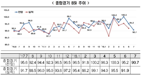7월 기업경기실사지수(BSI)전망치 90.7로 17개월만에 가장 낮아