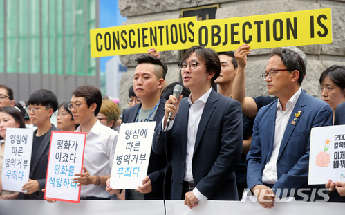 【서울=뉴시스】임태훈 기자 = 28일 오후 서울 종로구 재동 헌법재판소 앞에서 열린 '양심적 병역거부' 관련 헌법재판소 결정에 대한 입장 발표 기자회견에서 국제앰네스티 한국지부, 군인권센터 등 시민단체 회원들이 대체 복무제 마련을 촉구하는 구호를 외치고 있다. 2018.06.28. [email protected]