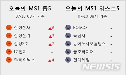 【서울=뉴시스】이국현 기자 = 10일 빅데이터 시장심리지수(MSI)가 가장 높은 '톱5'에 삼성전자(005930), 삼성전기(009150), 삼성SDI(006400), LG전자(066570), SK하이닉스(000660)가 선정됐다.