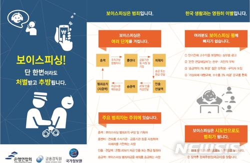 금감원은 은행연합회, 국가정보원과 함께 보이스피싱 범죄 가담 우려 대상의 경각심 고취 및 선제적 범죄 예방을 위한 팜플렛(홍보물)을 제작해 배포한다고 밝혔다.홍보물은 한국어·영어·중국어 등 3개국어로 쓰여진다.