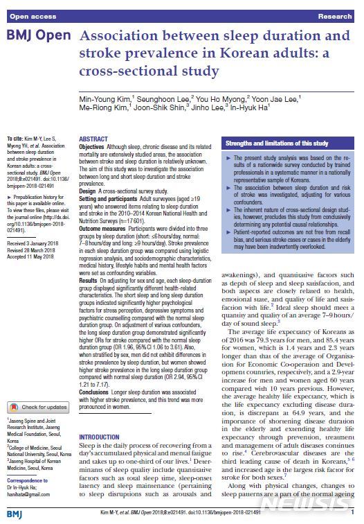 연구팀은 한국 질병관리본부의 5∙6기 국민건강영양조사(2010~2014년) 원시자료를 토대로 자가 설문지를 통해 뇌졸중의 진단 여부와 수면 시간에 응답한 1만7,601명의 자료를 수집했다. 대상자 집단은 하루 평균 ▲6시간 이하 7,369명(42%) ▲7~8시간 8918명(51%) ▲9시간 이상 1314명(7%) 그룹으로 분류했다. 각 그룹은 사회인구학적 특성과 질병력, 생활 습관, 정신건강 요인을 혼란변수로 설정하여 뇌졸중 유병률을 로지스틱 회귀분석을 통해 비교했다.