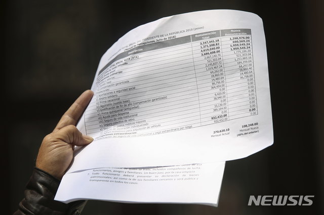【멕시코시티 = AP/뉴시스】 오늘 12월 취임을 앞둔 멕시코의 대통령 당선인 안드레스 마누엘 로페스 오브라도르가 15일 기자회견에서 현행 대통령 봉급 내역과 자신이 받을 봉급을 대조한 서류를 들고 정부긴축정책에 대해 밝히고 있다.