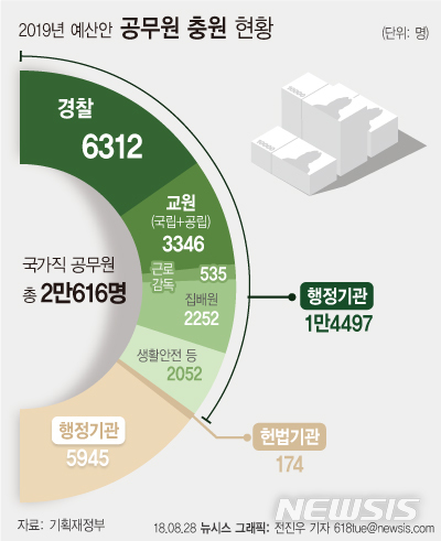 이중 국가직 2만1000개는 ▲경찰 6312개 ▲군(軍)무원 5945개 ▲국공립 보건·영양·상담 교원 3346개 ▲집배원 2252개 ▲헌법기관 174개 ▲질병 검역·미세먼지 저감·근로감독 등 생활안전 2587명 등으로 배분·충원한다. 정부는 인건비로 4000억원 쓰일 것으로 봤다.