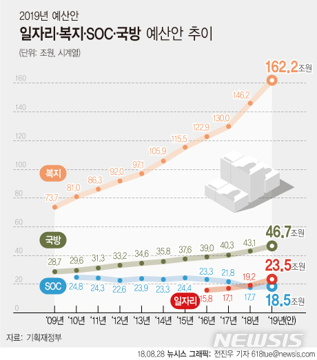 문재인 정부가 들어선 지난해와 올해 본예산 기준 일자리 예산은 36조원에 달했고 두 차례 일자리 추가경정예산(추경)과 일자리안정자금까지 합하면 총 54조원을 퍼부었다.