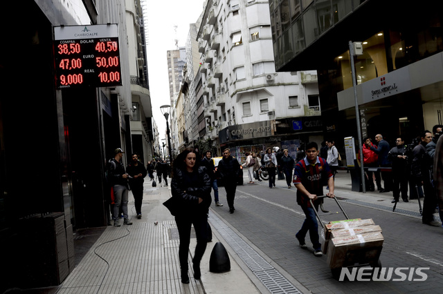 【부에노스아이레스(아르헨티나) = AP/뉴시스】차미례 기자 = 아르헨티나 중앙은행은 30일(현지시간) 사상 최저로 급락한 페소화의 추락을 멈추기 위한 노력의 하나로 기준금리를 60%로 인상한다고 발표했다. 이는 세계에서 가장 높은 기준 금리이다.
