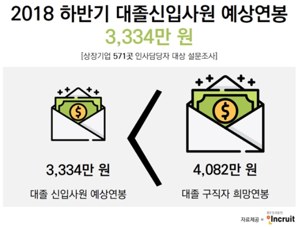 【서울=뉴시스】김종민 기자 = 2018년 하반기 대졸신입사원 초임 연봉이 3334만원으로 예상됐다.