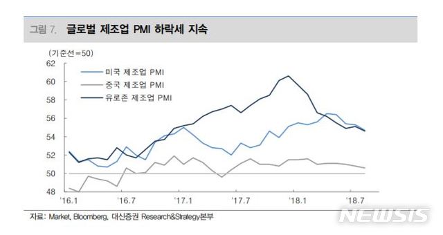 이어 "무역분쟁의 여파가 글로벌 펀더멘털에 미치는 영향력은 이제부터 본격적으로 가시화될 것"이라며 "이미 미국, 중국, 유럽의 제조업 PMI 지표는 수개월째 둔화되고 있고, 미국 기업들의 투자·고용이 위축될 가능성도 높아지고 있다"고 지적했다.