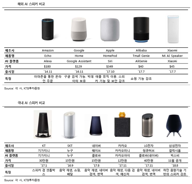 이동주 KTB투자증권 연구원은 "글로벌 대형 ICT 업체들은 자사의 인공 지능비서(AI Assistant) 플랫폼을 AI 스피커에 접목시키면서 음성·언어데이터를 확보하고 AI 생태계 조성을 위한 시발점으로 삼고자 한다"면서 "AI 스피커는 업체들이 머신 러닝을 통해 축적한 데이터의 양이 더욱 방대해지면서 단순 음악 재생에서 쇼핑, 일정 관리, 일상 대화, 쇼핑, 다른 기기 제어 등 제공되는 서비스의 양과 질이 지속적으로 향상되고 있다"고 말했다.